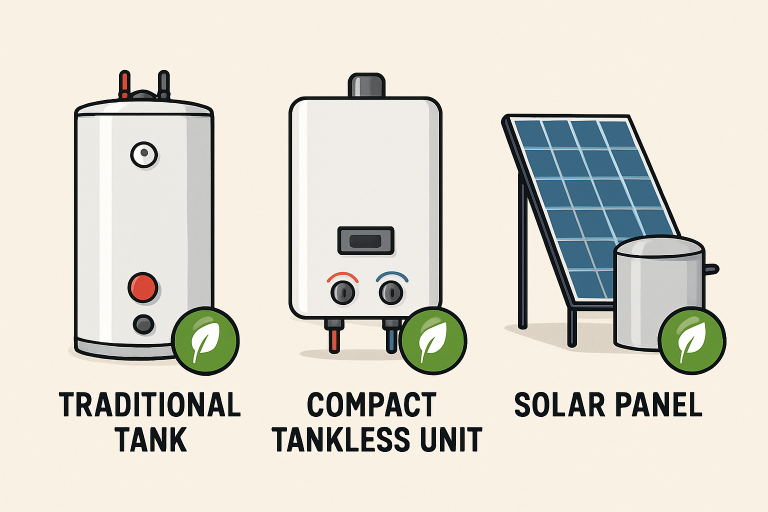 - Heat pump, tankless, and solar water heating systems represent the most efficient technologies.