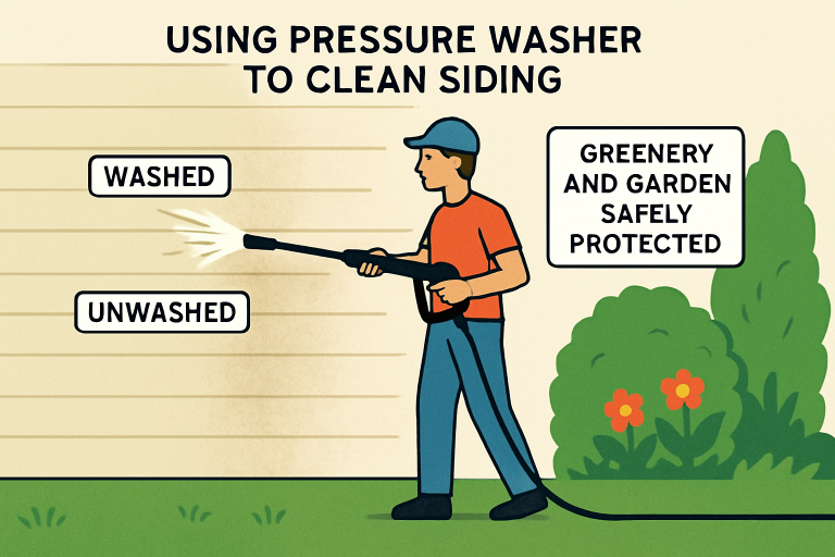 An incorrectly used pressure washer can do more harm than good. Common mistakes include using too much pressure, which can gouge wood, strip paint, or force water behind siding. Spraying at windows can cause them to shatter or allow water to leak into your home. Avoid pointing the spray upward beneath the lap siding to keep out moisture. Always use the appropriate nozzle and maintain a safe, steady distance from the surface being washed.